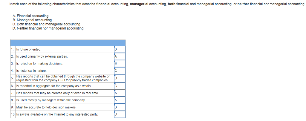 Which of the following are characteristics of managerial a. Match the following characteristic to. It is used to produce specific management reports c.
